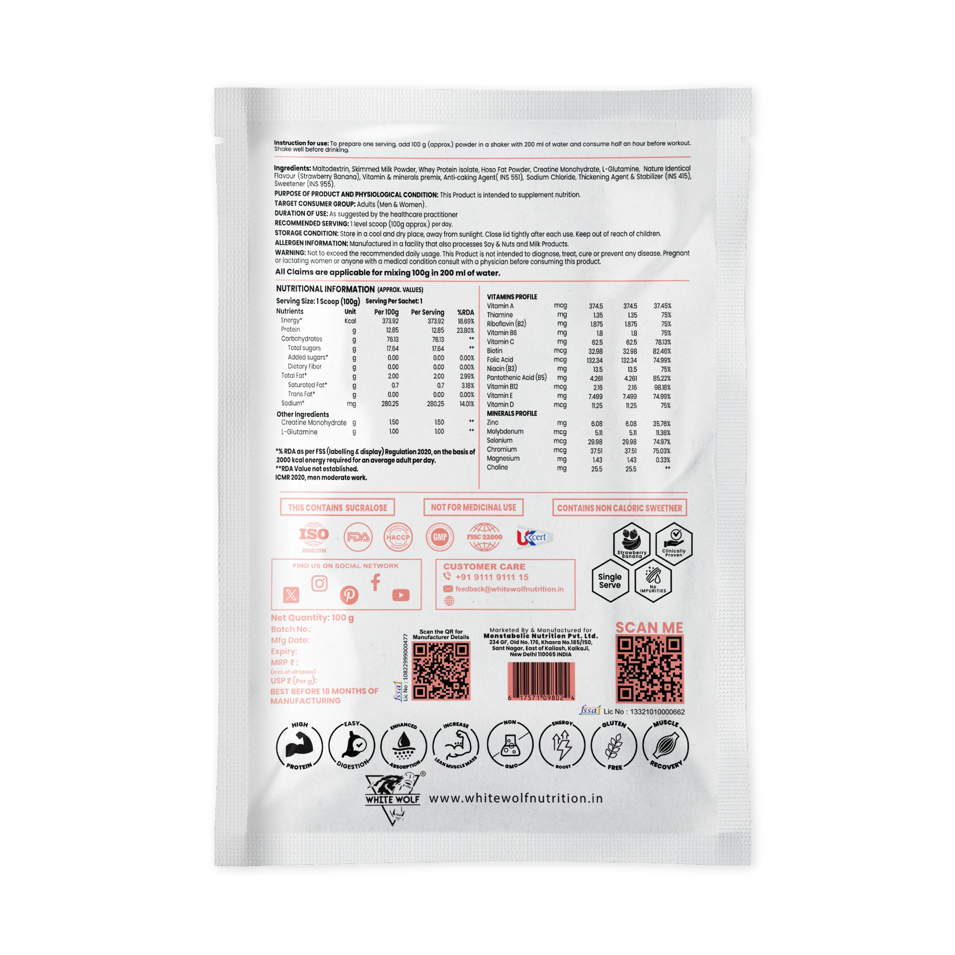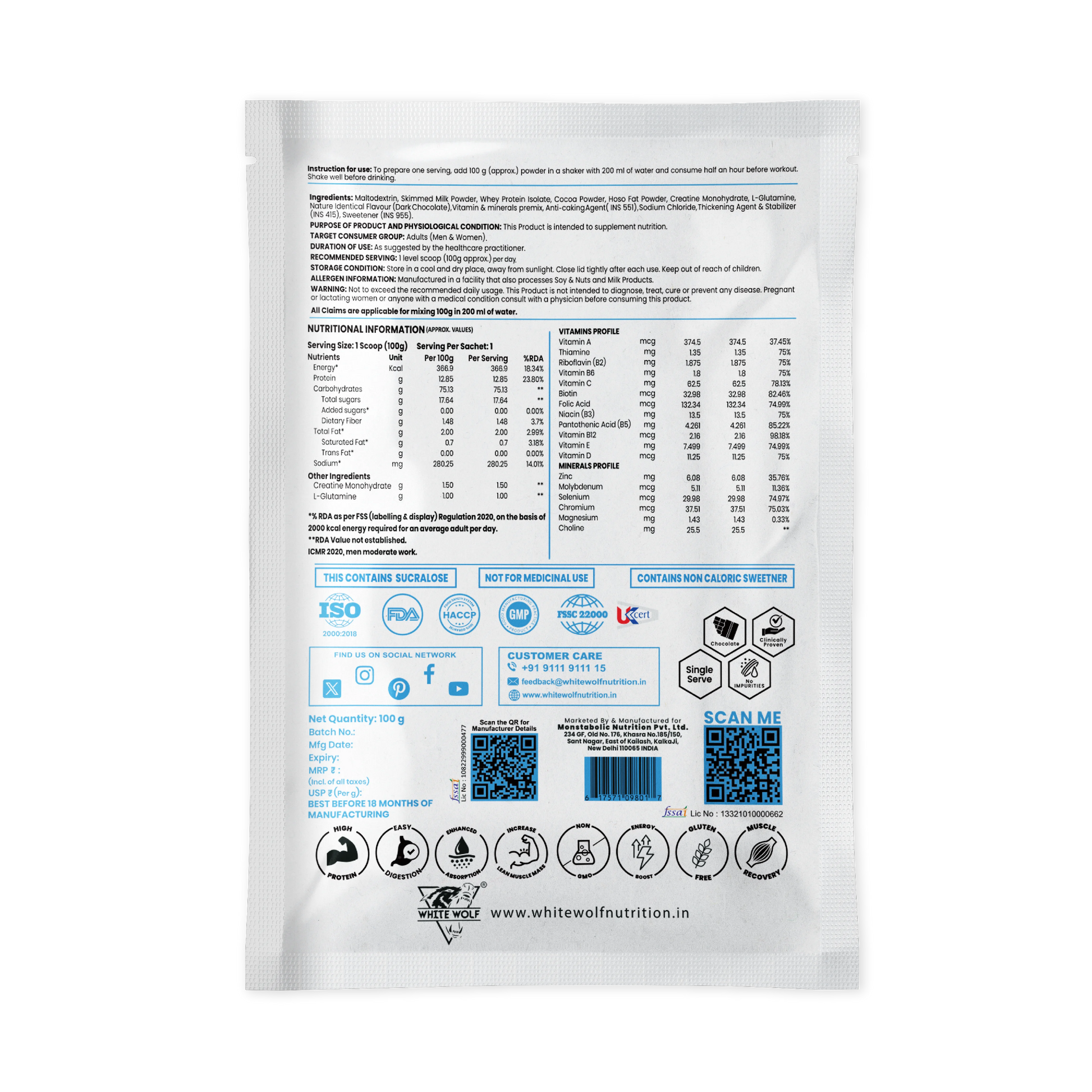 Maltodextrin, Skimmed Milk Powder, Whey Protein Isolate, Cocoa Powder, Hoso Fat Powder, Creatine Monohydrate, L-Glutamine, Nature Identical Flavour (Dark Chocolate), Vitamin & minerals premix, Anti-caking Agent (INS 551), Sodium Chloride, Thickening Agent & Stabilizer (INS 415), Sweetener (INS 955).