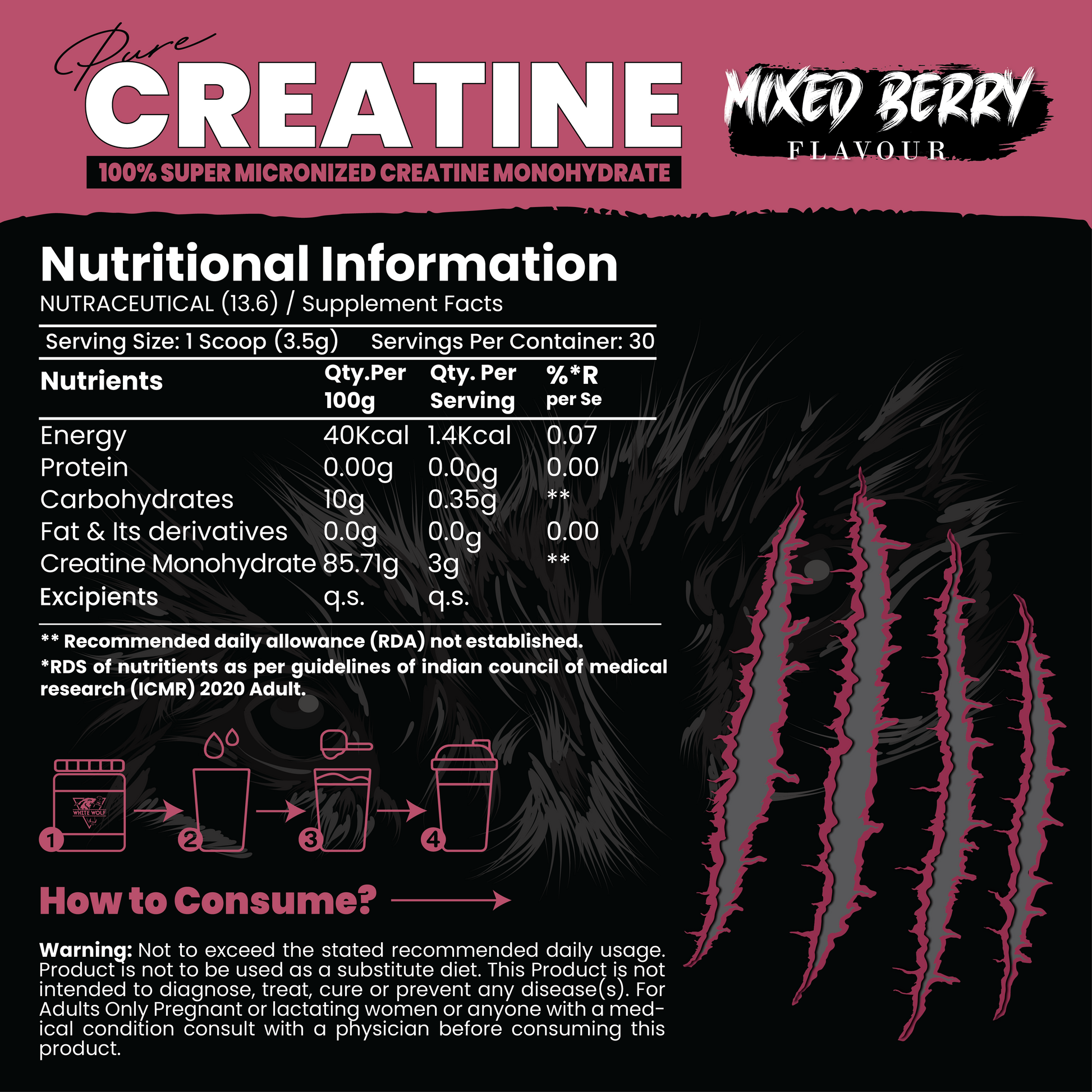 Creatine Monohydrate , Maltodextrin, Acidity Regulator (INS 330), Artificial Sweetener (INS 955), Preservative ( Ins 202 ), Antioxidant ( INS 320 ) Contains Permitted synthetic Food Color (INS 133) and added Flavor nature identically flavoring substance -Mixed Berry